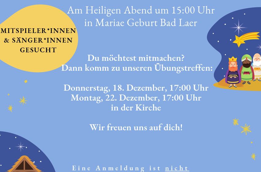 Ihr habt Lust, beim Krippenspiel mitzumachen? Dann kommt zu den Proben am 18. & 22.12. um 17 Uhr in die katholische Kirche. Man kann mitspielen oder mitsingen. Eine Anmeldung ist nicht ...