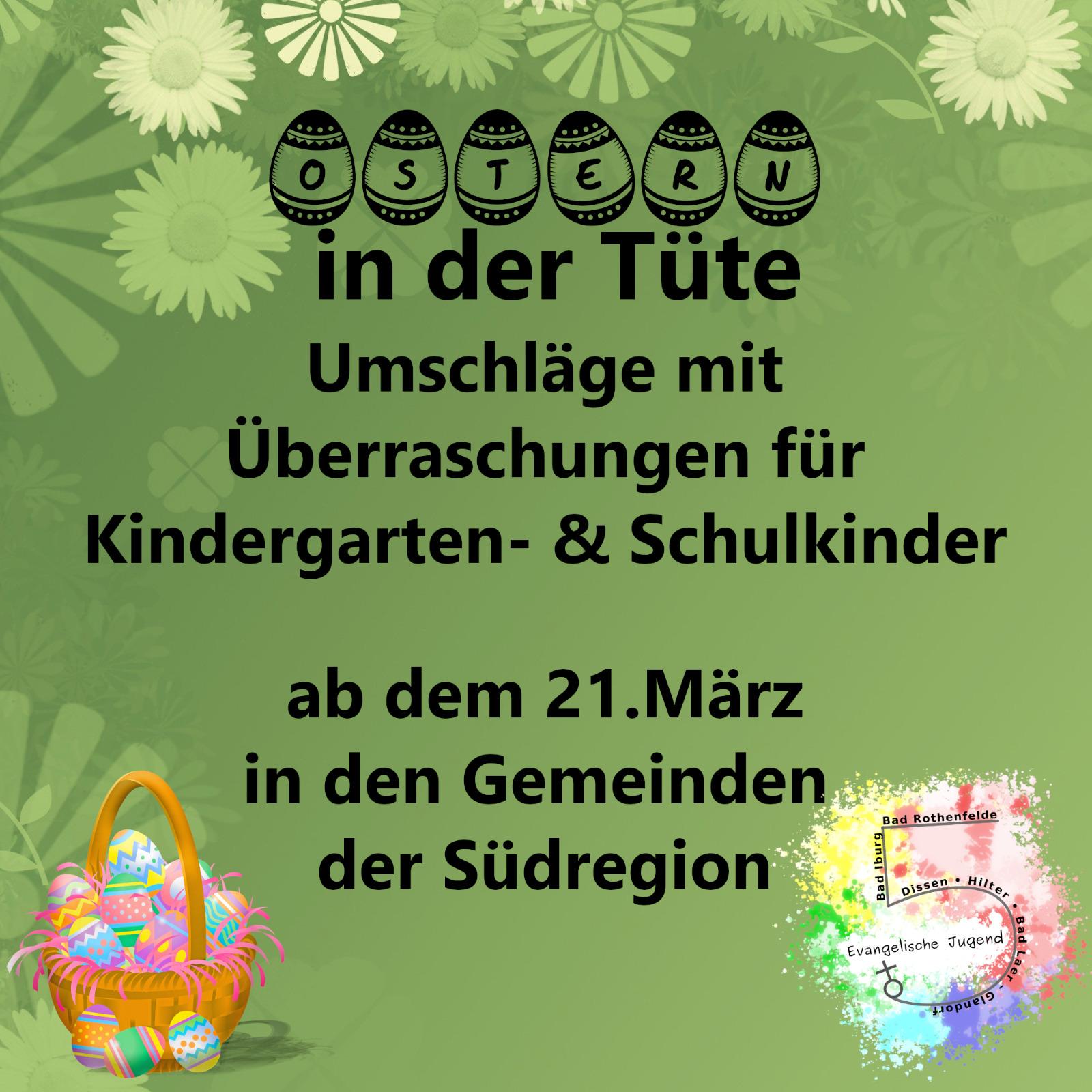 Basteln gegen die Lockdown-Langeweile. In Anlehnung an den "Advent in der Tüte" im letzten Dezember hat sich die evangelische Jugend der Südregion wieder eine kleine Bastelaktion ausgedacht. Am Sonntag, dem 28. März, können von 12 bis 15 Uhr am evangelischen Gemeindehaus Umschläge mit allerlei Dingen zum Thema Ostern abgeholt werden. Das Angebot richtet sich an Kinder im Kindergartenalter bis hin zur 4. Klasse.