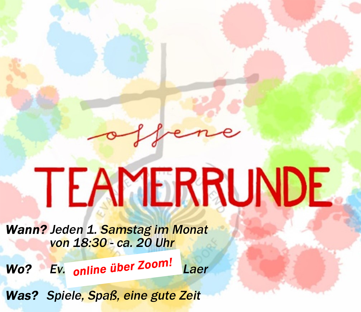 Sich treffen, sich austauschen und Spaß haben. Die offene Teamerrunde ist eine lockere Zusammenkunft der Teamer der Gemeinde, um gemeinsam einen schönen Abend zu verbringen. Sie steht aber auch allen Jugendlichen ab Konfialter offen, die sich für die Jugendarbeit interessieren und mehr zu dem Thema wissen wollen.